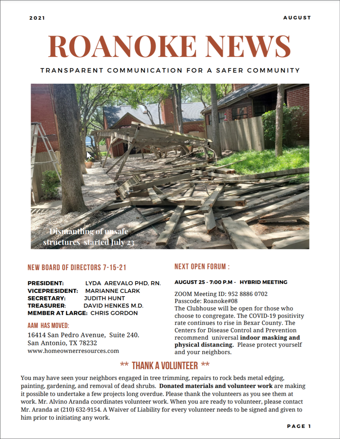 Wednesday, August 25th, 2021 at 7:00pm In response to the current Covid-19 outbreak and in an attempt to help reduce the spread, the Roanoke HOA Board has elected to hold this months meeting as a hybrid meeting by Zoom. Please use the following instructions to call into the meeting if doing so. Roanoke HOA … Continue reading Open Forum, August 2021